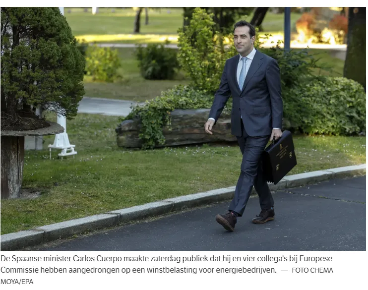 De ministers van Financiën van Spanje, Duitsland, Italië, Portugal en Oostenrijk hebben de Europese Commissie opgeroepen om een tijdelijke belasting in te voeren op de winsten van energiebedrijven die profiteren van de gestegen olieprijzen als gevolg van de Iran-oorlog. Volgens de ministers legt de stijging van de energieprijzen een zware last op de Europese economie en burgers. Zij benadrukken dat deze last eerlijk moet worden verdeeld en dat wie profiteert van de oorlog ook een bijdrage moet leveren aan het verlichten van de last voor de bevolking.